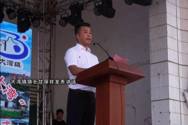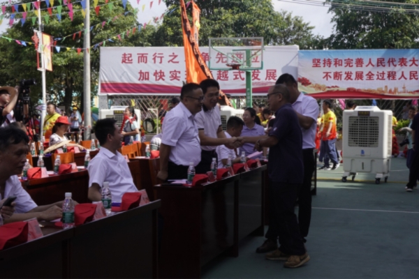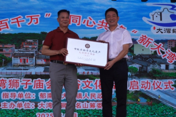 云浮市非物质文化遗产大湾狮子名山筹委会负责人李焕业向广东渝粤建筑工程有限公司代表颁授“大湾狮子庙会(民俗)”牌匾,见证传统文化的传承与延续。
