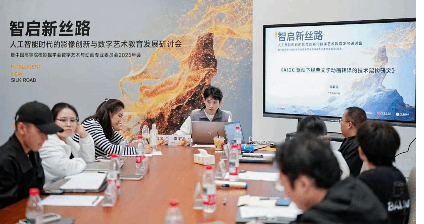 研讨中,李轩墨结合学校数字艺术专业的教学实践,以《AIGC赋能经典文学动漫化转译架构研究》为题,分享了学校在课程体系中融入 AI 影像工具(如 AI 辅助分镜设计、智能调色)的具体做法:通过 “项目式教学”,引导学生将 AI 技术应用于短视频创作、动画片段生产等实践任务,既提升了创作效率,又培养了学生 “技术 + 艺术” 的复合型思维。他提出的 “AI 工具需与传统影像美学结合,避免技术异化艺术表达” 的观点,得到了分会场其他学者的认同 —— 西安邮电大学陈宇、刘贲,深圳大学汪若曦学者等纷纷与他交流,探讨 AI 技术在应用型院校教学中的落地难点与解决方案。
