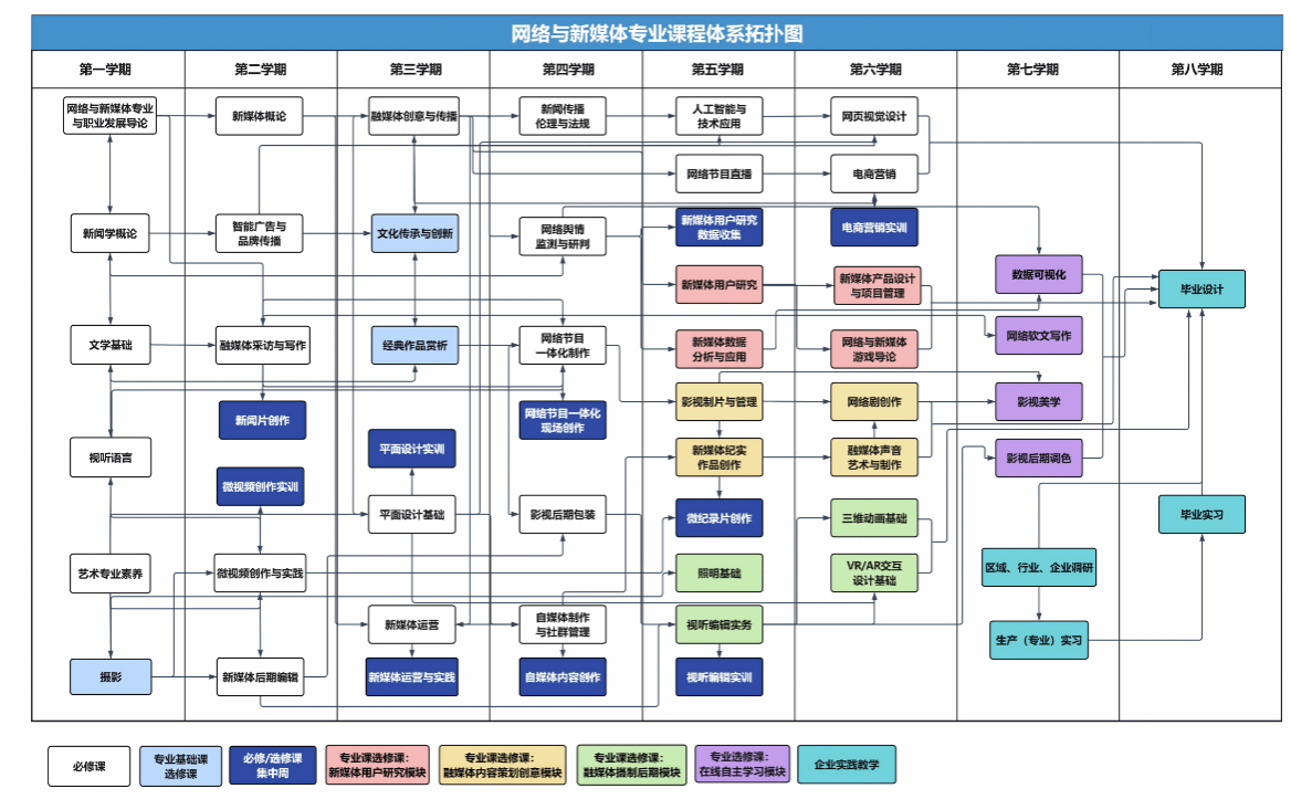 专业核心课程:新闻学概论、融媒体创意与传播、新媒体概论、摄影、视听语言、融媒体采访与写作、新媒体后期编辑、文学基础、网络舆情监测与研判。